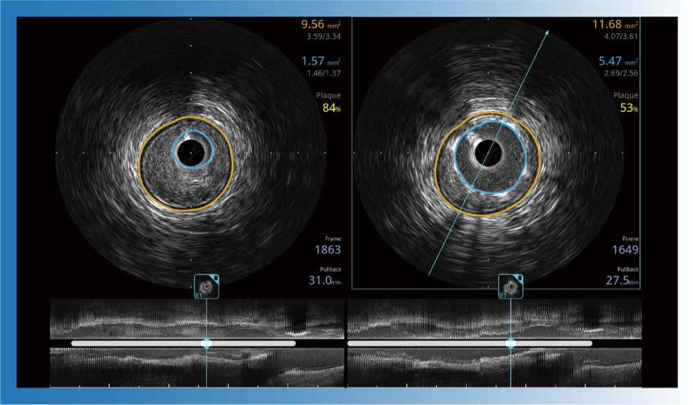 血管内超声(IVUS) 通过对病变程度、性质和累及范围的精确判断,可帮助选择治疗策略和方法,指导介入治疗过程,能够降低主要不良心血管事件,改善预后,在复杂病变介入治疗中用于指导支架置入的优势更为明显。血管内超声(IVUS)已成为精准心血管介入治疗的“金标准”。